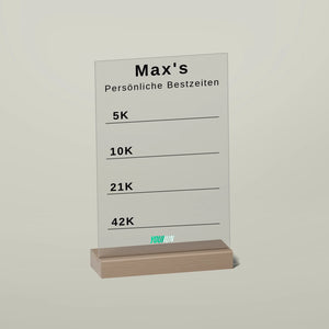 Halte deine Lauf-Fortschritte elegant fest 🏃♂️. Dieses Acrylglasschild wurde speziell entwickelt, um deine persönlichen Bestzeiten (5K, 10K, Halbmarathon, Marathon) übersichtlich zu präsentieren. Eine ideale Ergänzung zu deiner Medaillensammlung oder als Geschenk für ambitionierte Läufer und Triathleten.